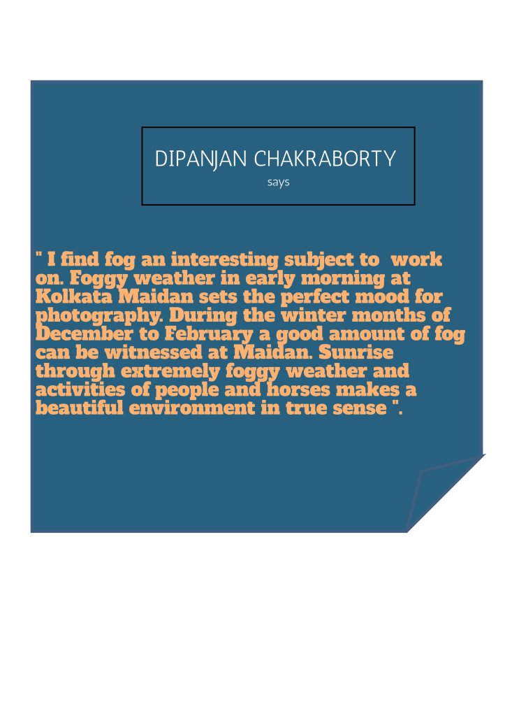 World Photo Freaks member and a Kolkata based photographer Mr.Dipanjan Chakraborty potrays a beautiful photo tale on Life in Maidan during winters which mainly focuses on the element of fog which adds drama to his creativity.